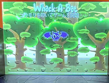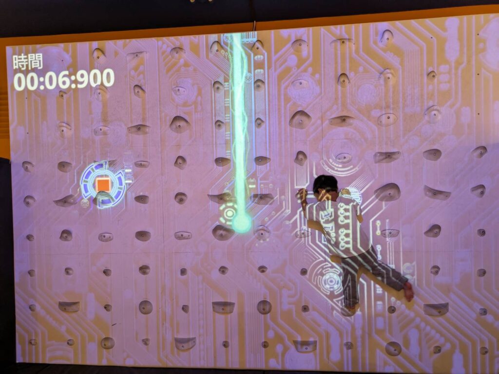 壁にプロジェクターで映し出されたゲーム映像に合わせて、クライミングしながらミッションをこなす、まさに「動けるゲーム」といった感じ!